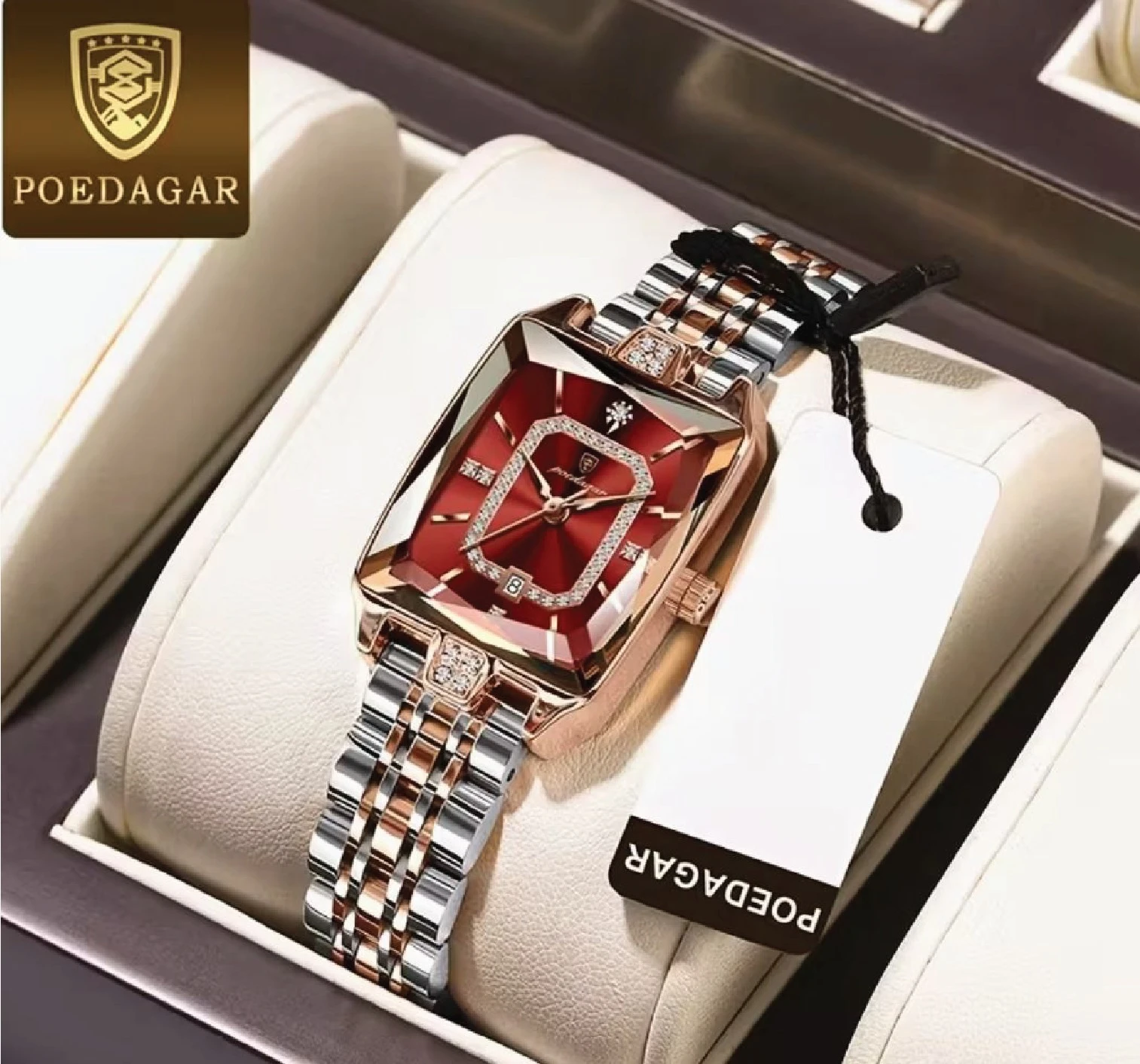 • ساعة نسائية أنيقة من POEDAGAR بتصميم مربع نحيف، تتميز بمينا أحمر عصري مع تفاصيل جذابة تضيف لمسة فاخرة لمعصمك.